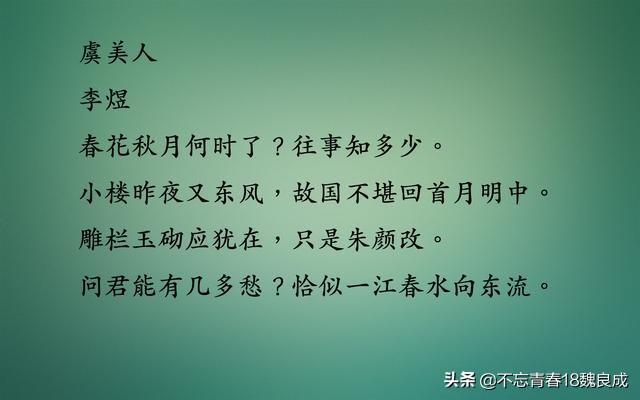 雕栏玉砌应犹在,只是朱颜改。问君能有几多愁?恰似一江春水向东流。
